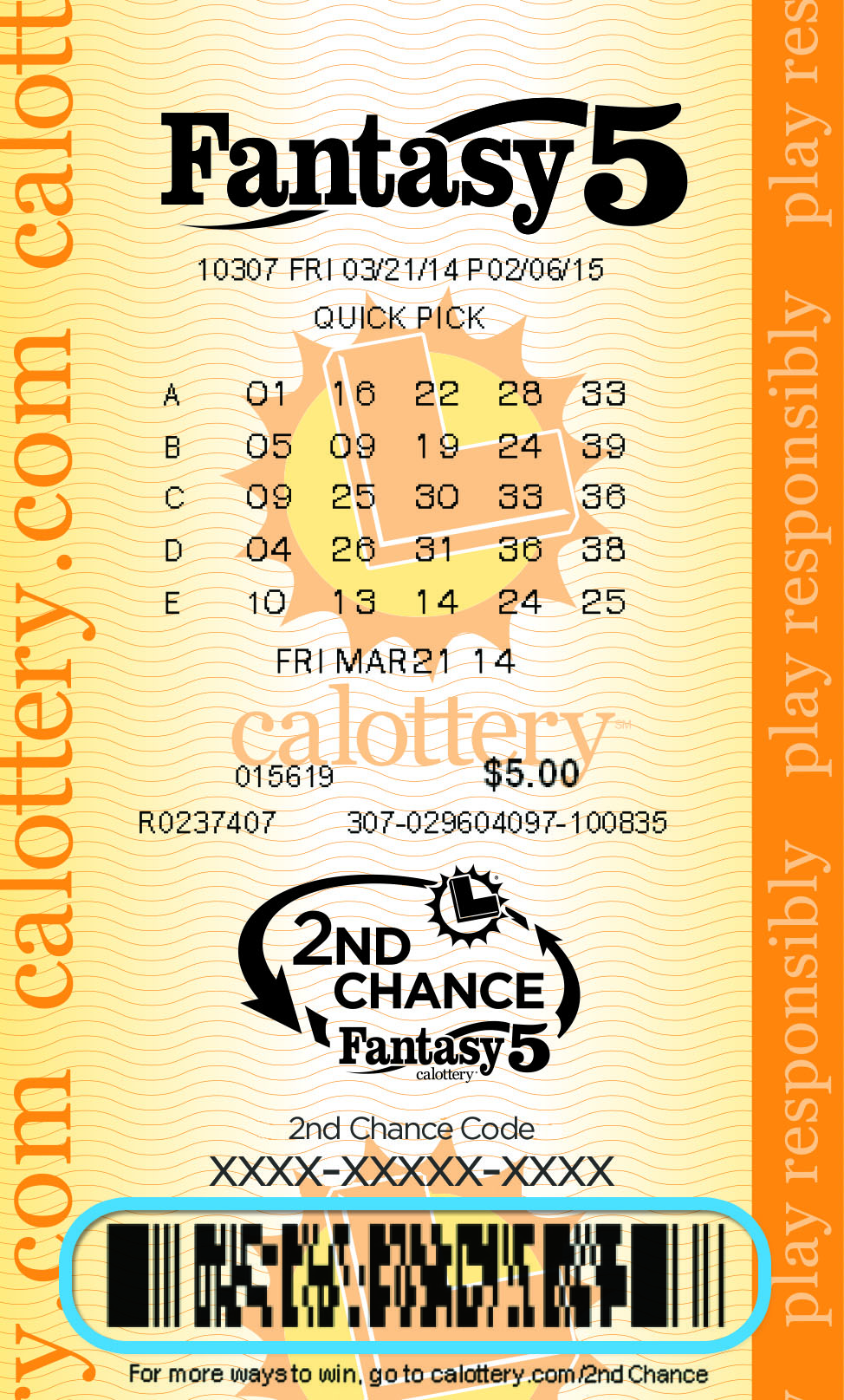 5달러를 초과하는 Fantasy 5 티켓의 고유 바코드는 티켓에 인쇄된 2nd Chance 코드 바로 아래에 있습니다.아래 이미지 참고:
