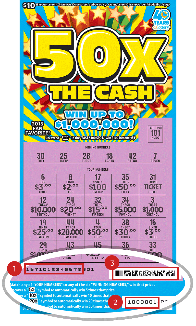 2nd Chance에 티켓을 입력하는 방법은 두 가지입니다.응모 코드의 처음 13자리(아래 1 참조)와 티켓 ID의 처음 7자리(아래 2 참조)를 입력하여 웹사이트에서 티켓을 제출하세요.빠르고 쉽게 플레이하려면 California Lottery 모바일 앱에서 바코드를 스캔하여(아래 3 참조) 티켓을 제출하세요.