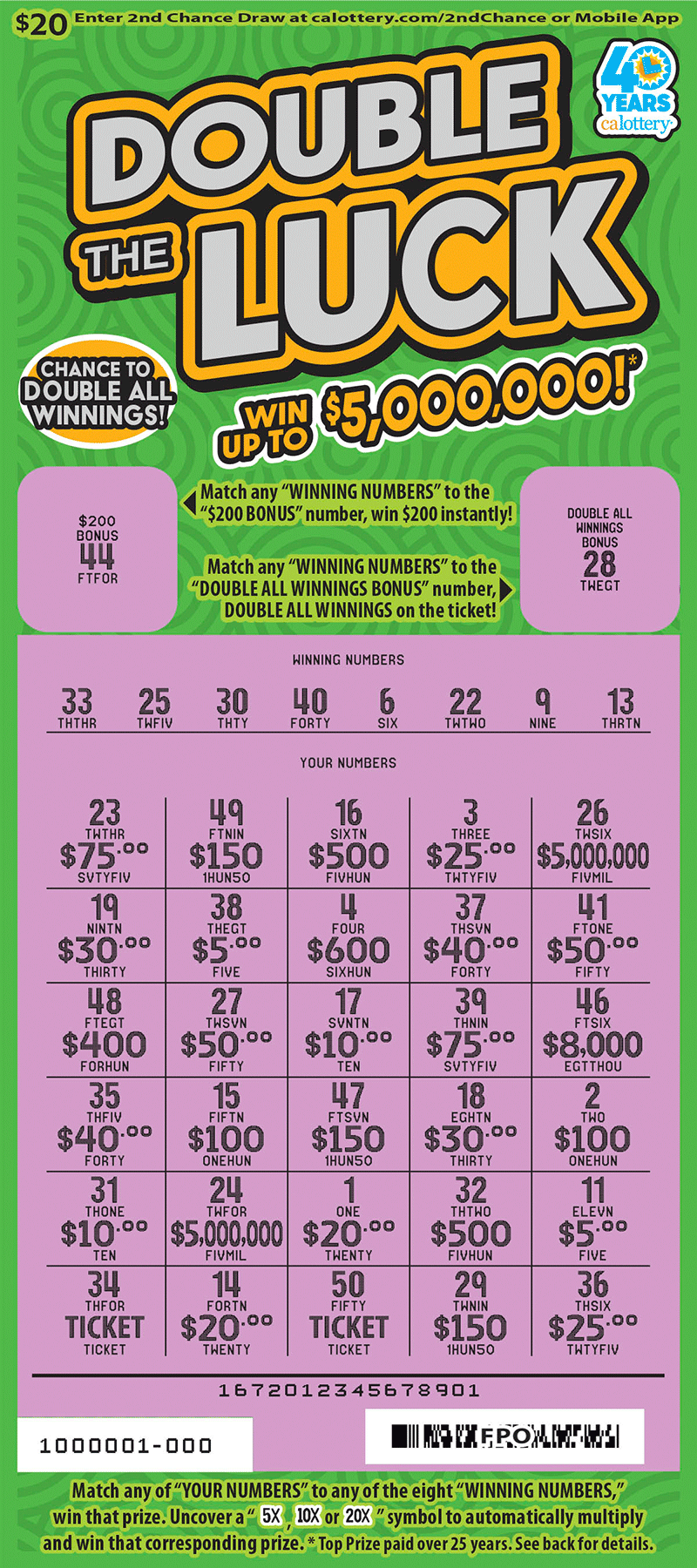 Double the Luck Scratchers®로 두 배의 재미를 만끽하세요. 5배, 10배 및 20배의 상금 배수 발견, $200 보너스 스팟 발견 시 200달러 즉석 당첨, Double All Winnings 보너스 스팟 발견 시 모든 상금 두 배 등의 기회가 기다립니다.최고 5,000,000달러의 상금 당첨을 목표로 펼쳐지는 31번의 기회에 도전해 보세요!