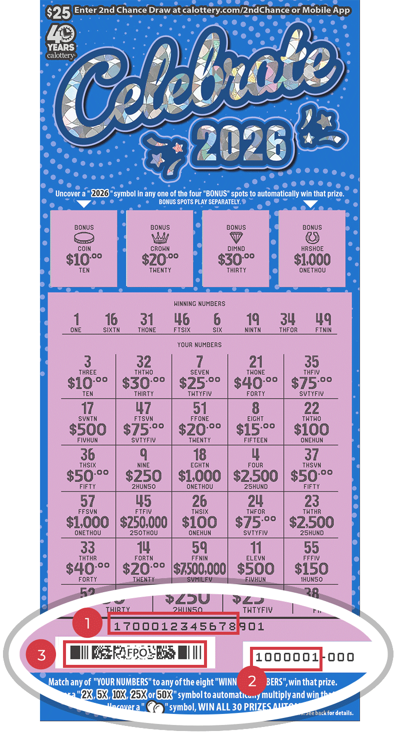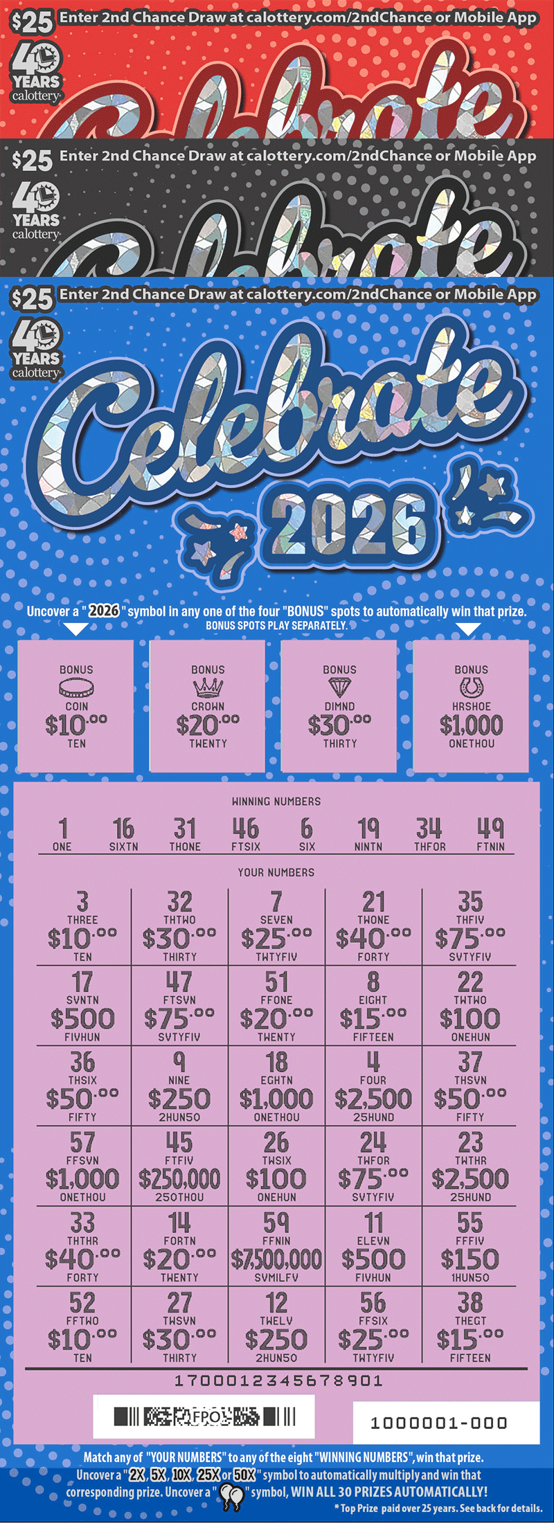 Khởi đầu năm tuyệt vời nhất của bạn với ba hình ảnh vé đầy hân hoan của Celebrate 2026 Scratchers®. Tận hưởng cơ hội tìm thấy hệ số nhân 2X, 5X, 10X, 25X, và 50X hoặc cơ hội trúng một lần cả 30 giải. Mang thêm không khí tiệc tùng vào cuộc chơi của bạn với bốn ô thưởng có cơ hội thắng tự động từ $50 đến $2,500. Cuộc đếm ngược đến niềm vui bắt đầu ngay bây giờ với 34 cơ hội rực rỡ để TRÚNG TỚI $7,500,000!