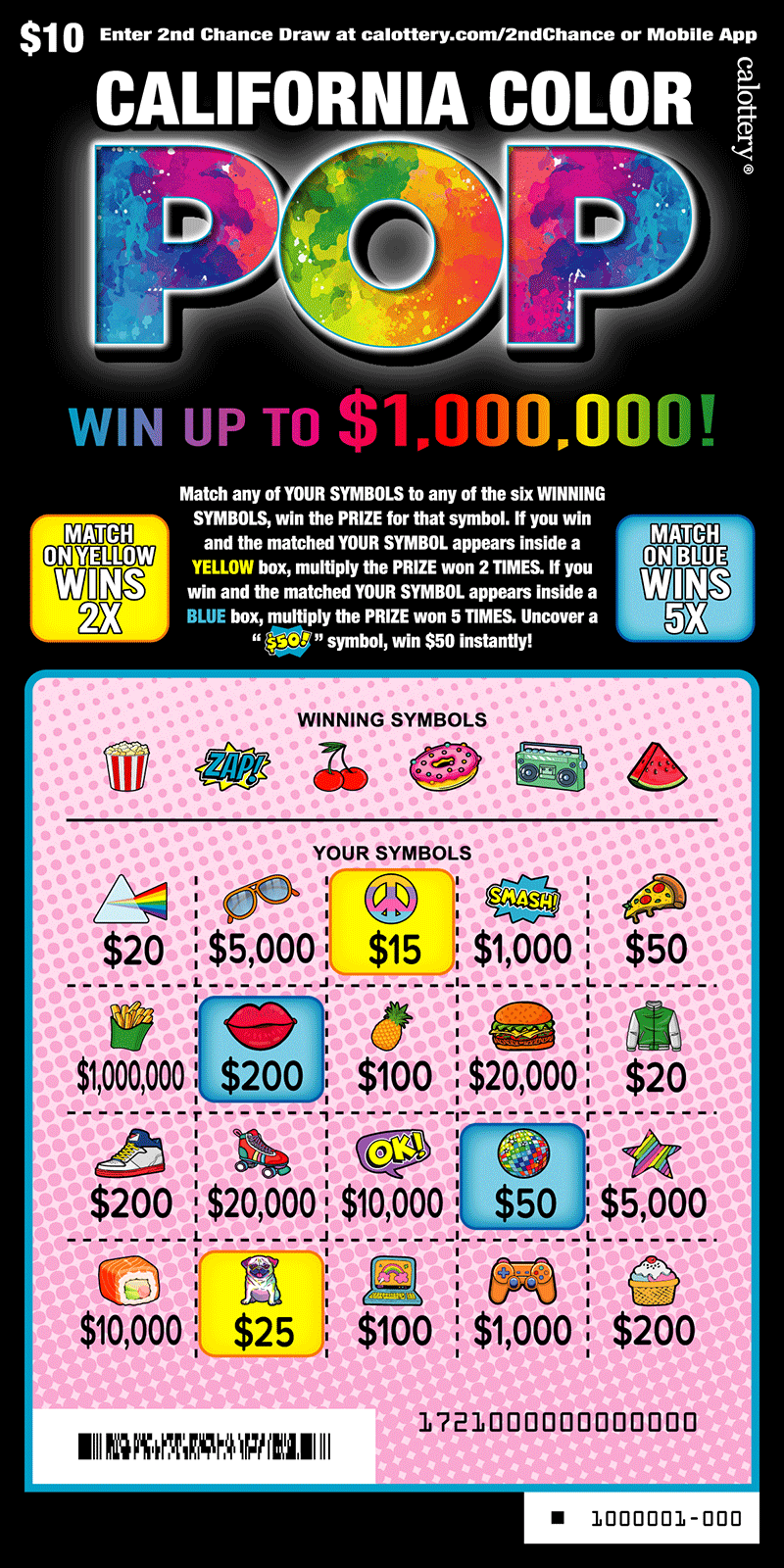 Brighten your day with a new way to play! California Color Pop Scratchers® invites you to go on the hunt for up to 20 chances to win. Search for charming symbols to win the prize shown or uncover an instant winning $50 symbol. For a colorful twist, if your winning symbol is shown in the yellow or blue box, you’ll win 2X or 5X the prize.